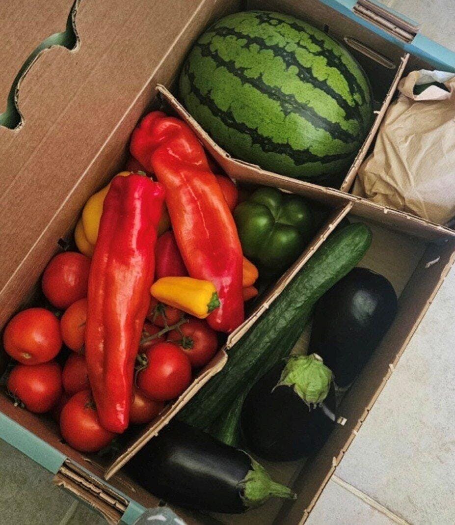 In unseren Boxen findest Du jede Woche eine bunte Auswahl an frischem Obst und Gemüse von bester Qualität. Hier findest Du eine Auswahl an möglichen Produkten:Tomaten, Gurken, Paprika, Zucchini, Auberginen, Brokkoli, Salat, Grüner Spargel, Süßkartoffeln, Lauch, grüne Bohnen, Clementinen, Orangen, Zitronen, Plattpfirsich, Granatapfel, Mango, Avocado, uvm.